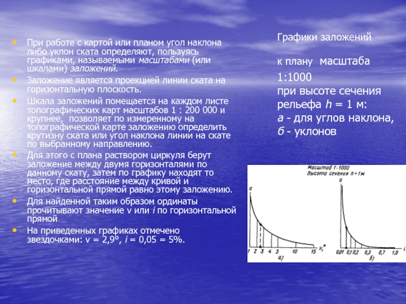 Для этого с плана раствором циркуля берут заложение между двумя горизонталями по данному скату, затем по графику находят то место, где расстояние между кривой и горизонтальной прямой равно этому заложению.