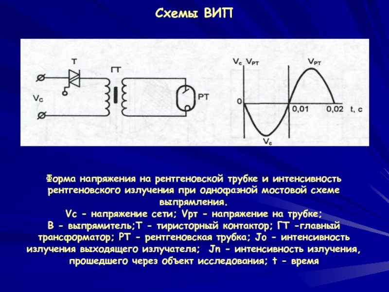 В - выпрямитель;Т - тиристорный контактор; ГТ -главный трансформатор; РТ - рентгеновская трубка; Jo - интенсивность излучения выходящего излучателя; Jn - интенсивность излучения, прошедшего через объект исследования; t - время