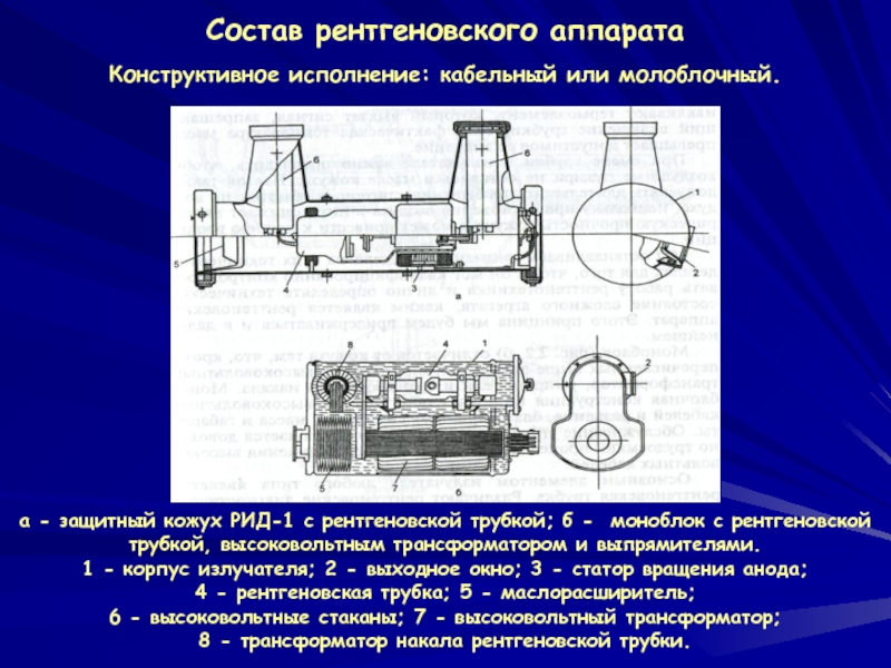 Состав аппарата: рентгеновская трубка, высоковольтное питающее устройство, пульт