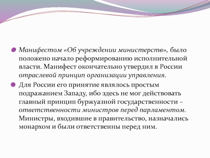 Слайд 23Манифестом «Об учреждении министерств», было положено начало реформированию исполнительной власти.