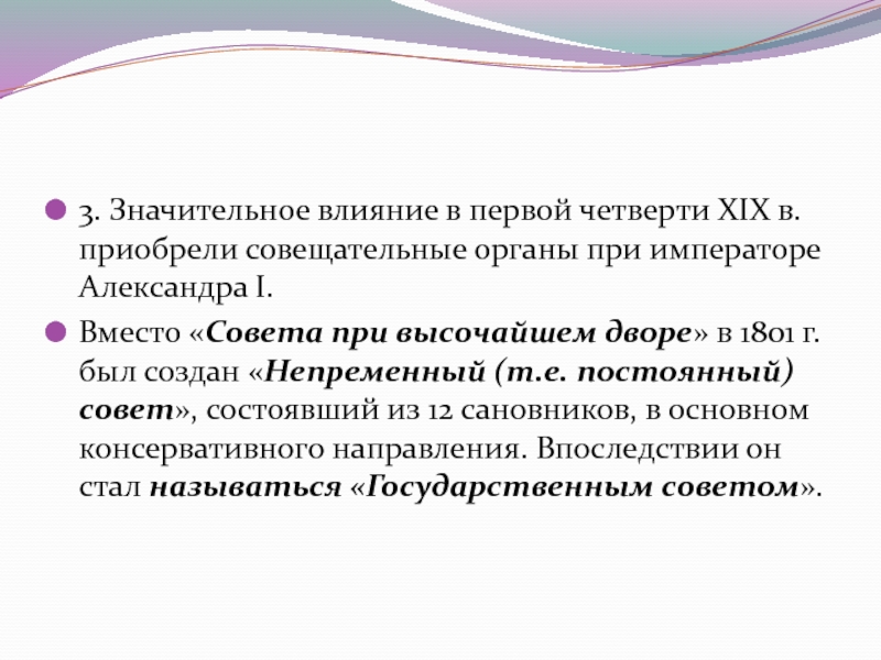 в 1801 г. был создан «Непременный (т.е. постоянный) совет», состоявший из 12 сановников, в основном консервативного направления. Впоследствии он стал называться «Государственным советом».