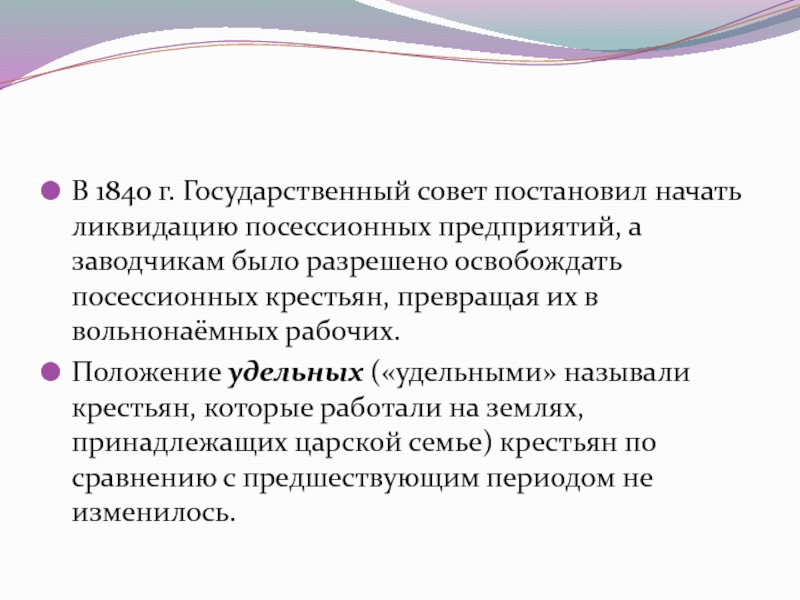 Слайд 11В 1840 г. Государственный совет постановил начать ликвидацию посессионных предприятий,