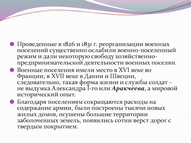 Слайд 8Проведенные в 1826 и 1831 г. реорганизации военных поселений существенно