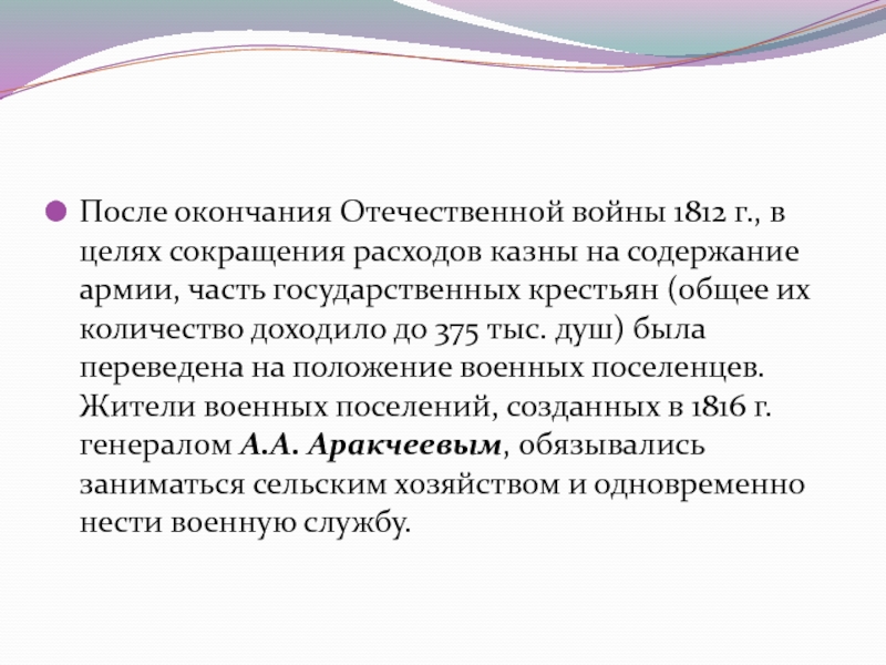 Слайд 7После окончания Отечественной войны 1812 г., в целях сокращения расходов