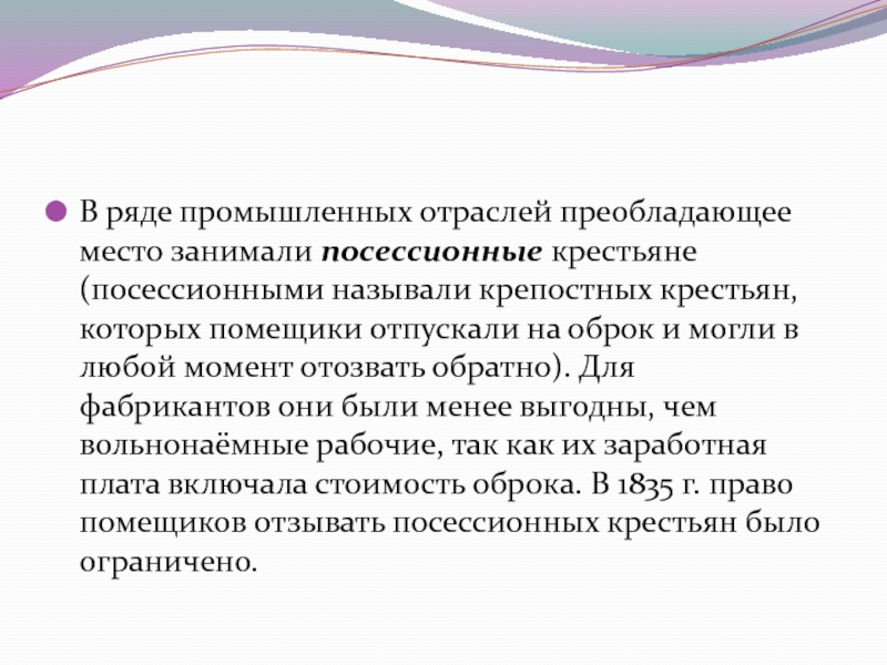 в любой момент отозвать обратно). Для фабрикантов они были менее выгодны, чем вольнонаёмные рабочие, так как их заработная плата включала стоимость оброка. В 1835 г. право помещиков отзывать посессионных крестьян было ограничено.