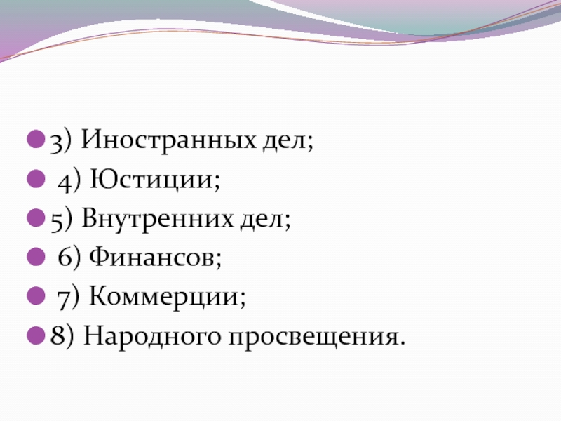 министерств», которыми предполагалось заменить устаревшую систему петровских коллегий. Учреждалось 8