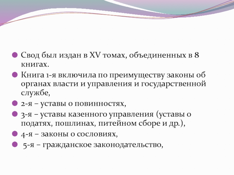 Слайд 32Свод был издан в XV томах, объединенных в 8 книгах.