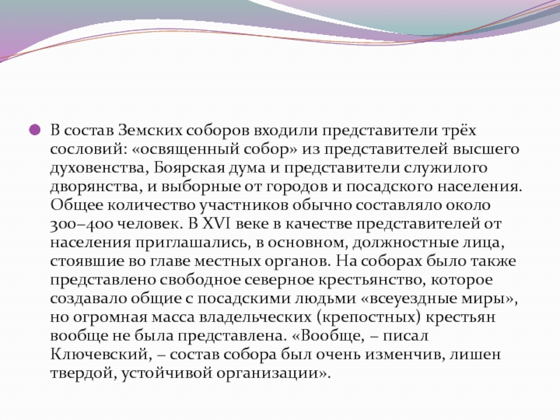 и выборные от городов и посадского населения. Общее количество участников обычно составляло около 300400 человек. В XVI веке в качестве представителей от населения приглашались, в основном, должностные лица, стоявшие во главе местных органов. На соборах было также представлено свободное северное крестьянство, которое создавало общие с посадскими людьми «всеуездные миры», но огромная масса владельческих (крепостных) крестьян вообще не была представлена. «Вообще, писал Ключевский, состав собора был очень изменчив, лишен твердой, устойчивой организации».