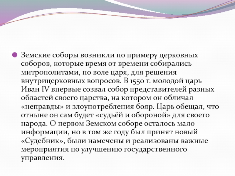 В 1550 г. молодой царь Иван IV впервые созвал собор представителей разных областей своего царства, на котором он обличал «неправды» и злоупотребления бояр. Царь обещал, что отныне он сам будет «судьёй и обороной» для своего народа. О первом Земском соборе осталось мало информации, но в том же году был принят новый «Судебник», были намечены и реализованы важные мероприятия по улучшению государственного управления.