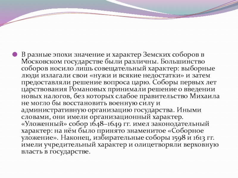 люди излагали свои «нужи и всякие недостатки» и затем предоставляли решение вопроса царю. Соборы первых лет царствования Романовых принимали решение о введении новых налогов, без которых слабое правительство Михаила не могло бы восстановить военную силу и административную организацию государства. Иными словами, они имели организационный характер. «Уложенный» собор 16481649 гг. имел законодательный характер: на нём было принято знаменитое «Соборное уложение». Наконец, избирательные соборы 1598 и 1613 гг. имели учредительный характер и олицетворяли верховную власть в государстве.