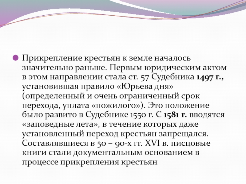 правило «Юрьева дня» (определенный и очень ограниченный срок перехода, уплата «пожилого»). Это положение было развито в Судебнике 1550 г. С 1581 г. вводятся «заповедные лета», в течение которых даже установленный переход крестьян запрещался. Составлявшиеся в 50 – 90-х гг. XVI в. писцовые книги стали документальным основанием в процессе прикрепления крестьян