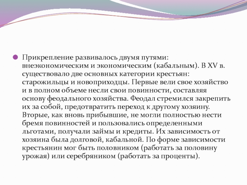 Слайд 20Прикрепление развивалось двумя путями: внеэкономическим и экономическим (кабальным). В XV