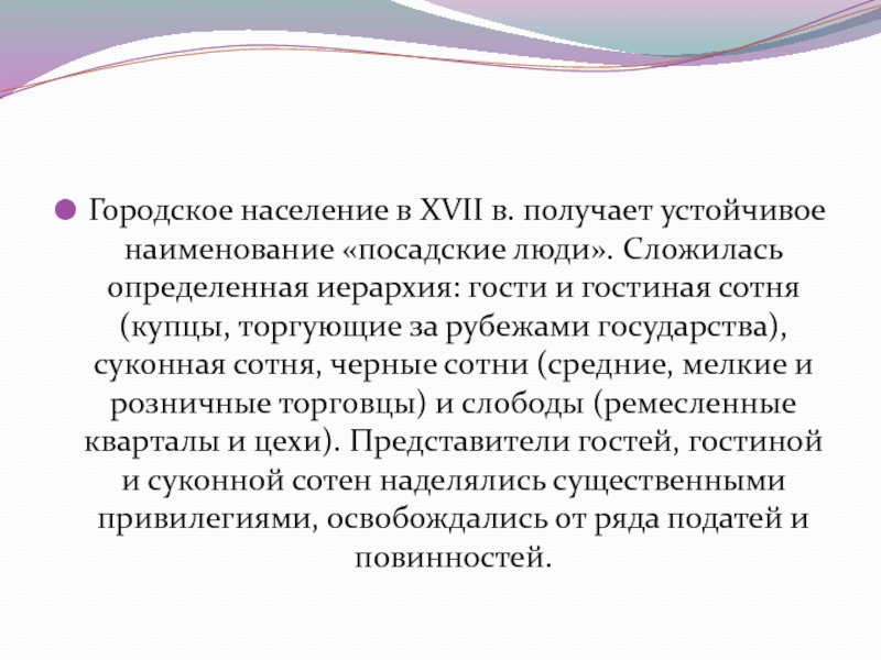 Слайд 15Городское население в XVII в. получает устойчивое наименование «посадские люди».