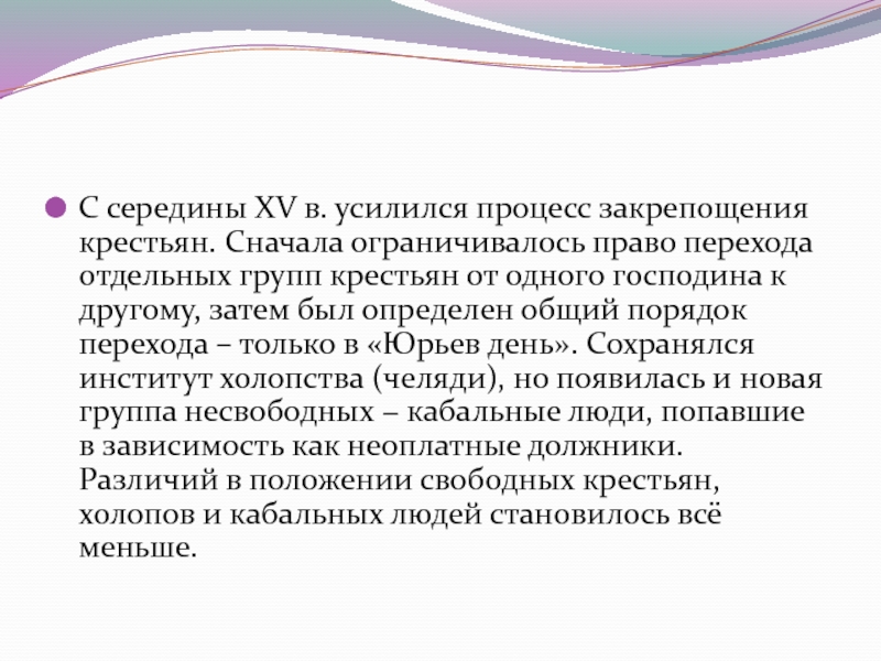 затем был определен общий порядок перехода – только в «Юрьев день». Сохранялся институт холопства (челяди), но появилась и новая группа несвободных кабальные люди, попавшие в зависимость как неоплатные должники. Различий в положении свободных крестьян, холопов и кабальных людей становилось всё меньше.