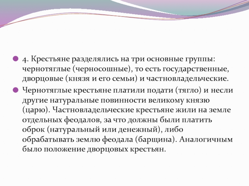 Слайд 164. Крестьяне разделялись на три основные группы: чернотяглые (черносошные), то