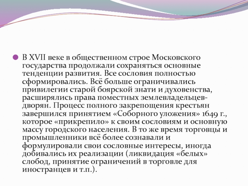 привилегии старой боярской знати и духовенства, расширялись права поместных землевладельцев-дворян. Процесс полного закрепощения крестьян завершился принятием «Соборного уложения» 1649 г., которое «прикрепило» к своим сословиям и основную массу городского населения. В то же время торговцы и промышленники всё более сознавали и формулировали свои сословные интересы, иногда добивались их реализации (ликвидация «белых» слобод, принятие ограничений в торговле для иностранцев и т.п.).