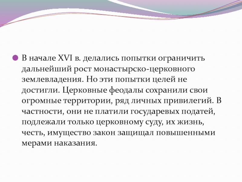 землевладения. Но эти попытки целей не достигли. Церковные феодалы сохранили