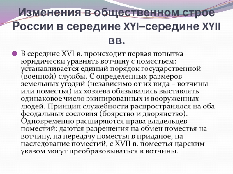 поместьем: устанавливается единый порядок государственной (военной) службы. С определенных размеров земельных угодий (независимо от их вида – вотчины или поместья) их хозяева обязывались выставлять одинаковое число экипированных и вооруженных людей. Принцип служебности распространялся на оба феодальных сословия (боярство и дворянство). Одновременно расширяются права владельцев поместий: даются разрешения на обмен поместья на вотчину, на передачу поместья в приданое, на наследование поместий, с XVII в. поместья царским указом могут преобразовываться в вотчины.