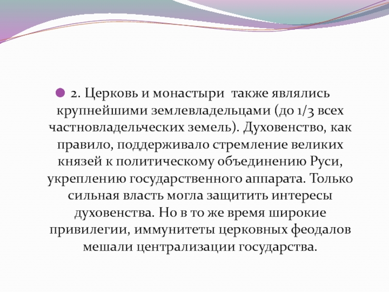к политическому объединению Руси, укреплению государственного аппарата. Только сильная власть могла защитить интересы духовенства. Но в то же время широкие привилегии, иммунитеты церковных феодалов мешали централизации государства.