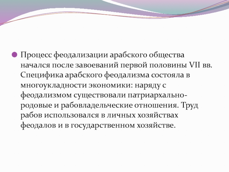 Слайд 8Процесс феодализации арабского общества начался после завоеваний первой половины VII