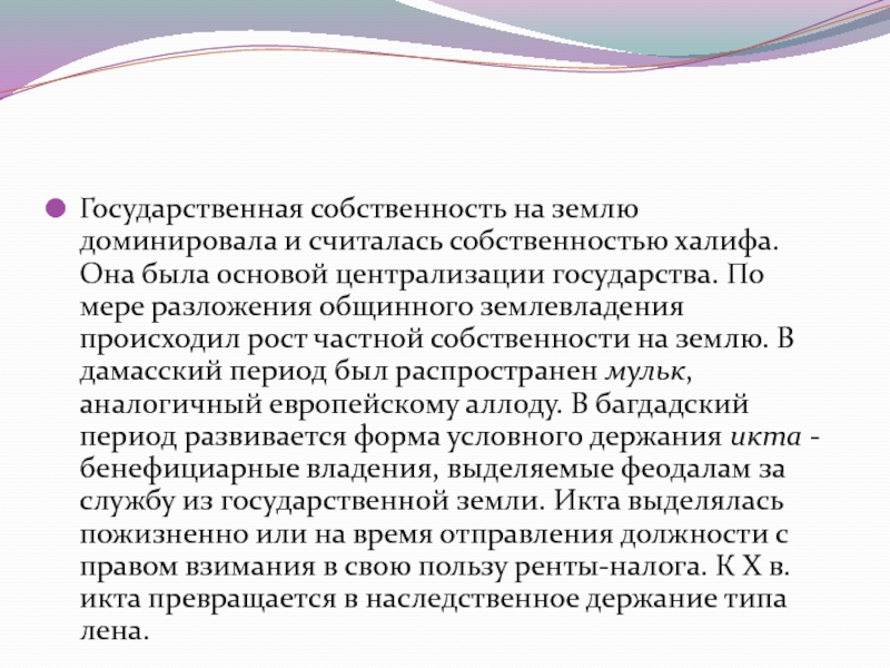 рост частной собственности на землю. В дамасский период был распространен мульк, аналогичный европейскому аллоду. В багдадский период развивается форма условного держания икта - бенефициарные владения, выделяемые феодалам за службу из государственной земли. Икта выделялась пожизненно или на время отправления должности с правом взимания в свою пользу ренты-налога. К X в. икта превращается в наследственное держание типа лена.