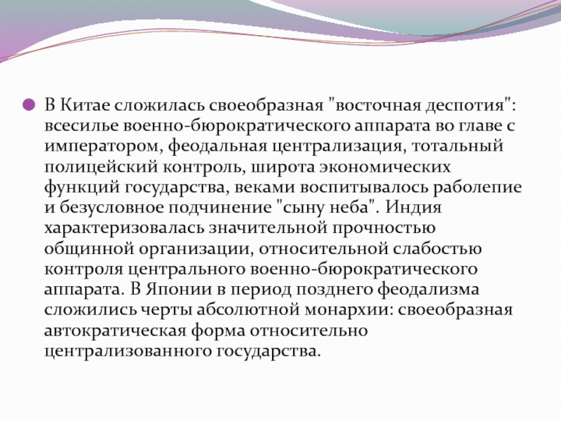 функций государства, веками воспитывалось раболепие и безусловное подчинение "сыну неба". Индия характеризовалась значительной прочностью общинной организации, относительной слабостью контроля центрального военно-бюрократического аппарата. В Японии в период позднего феодализма сложились черты абсолютной монархии: своеобразная автократическая форма относительно централизованного государства.
