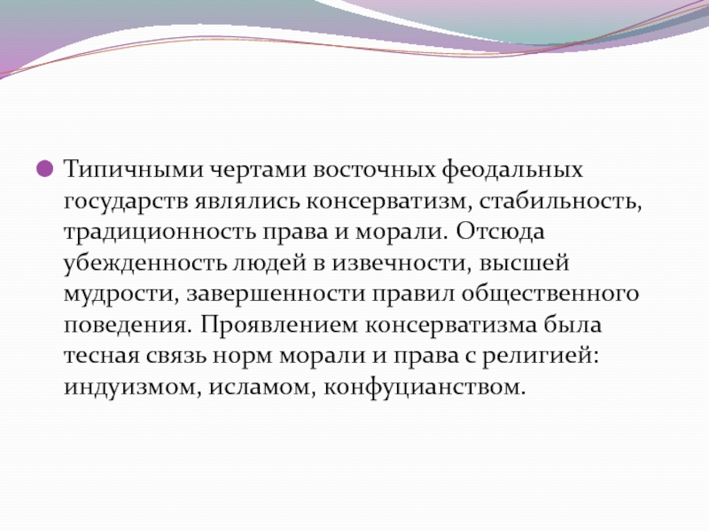 Слайд 5Типичными чертами восточных феодальных государств являлись консерватизм, стабильность, традиционность права