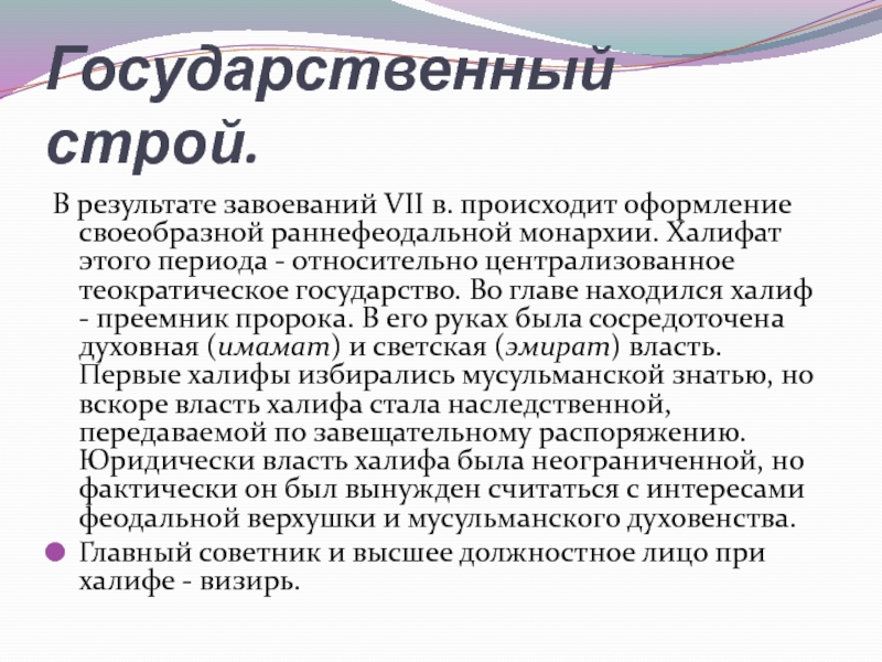 монархии. Халифат этого периода - относительно централизованное теократическое государство. Во