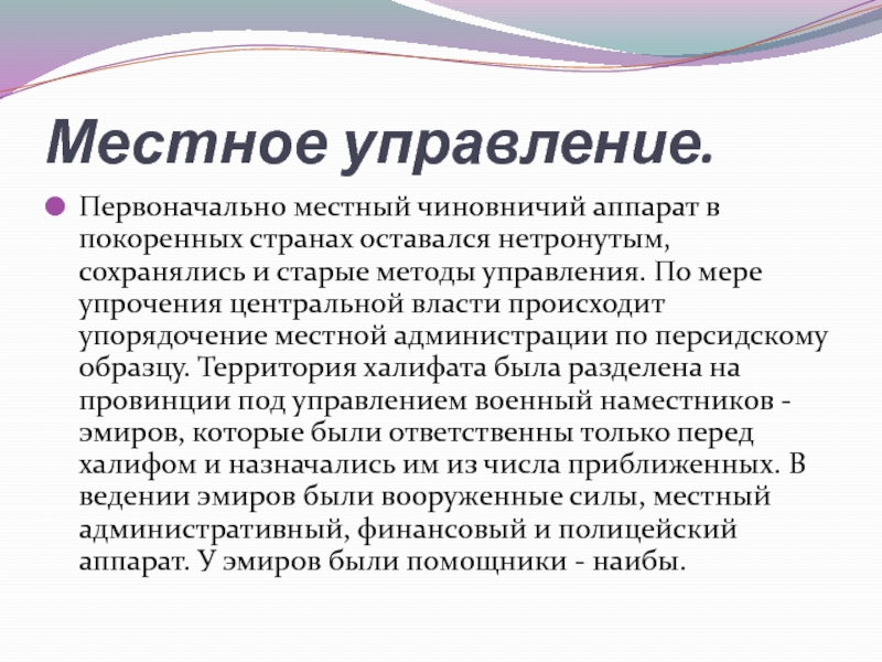 происходит упорядочение местной администрации по персидскому образцу. Территория халифата была разделена на провинции под управлением военный наместников - эмиров, которые были ответственны только перед халифом и назначались им из числа приближенных. В ведении эмиров были вооруженные силы, местный административный, финансовый и полицейский аппарат. У эмиров были помощники - наибы.