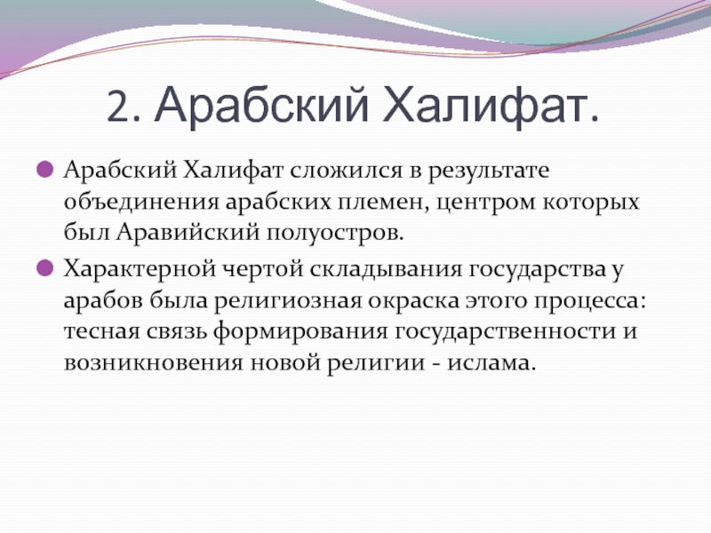была религиозная окраска этого процесса: тесная связь формирования государственности и возникновения новой религии - ислама.