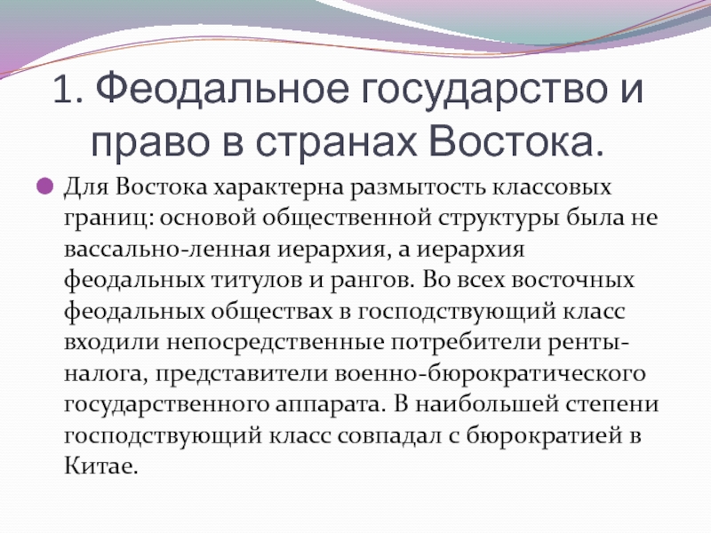 иерархия, а иерархия феодальных титулов и рангов. Во всех восточных феодальных обществах в господствующий класс входили непосредственные потребители ренты-налога, представители военно-бюрократического государственного аппарата. В наибольшей степени господствующий класс совпадал с бюрократией в Китае.