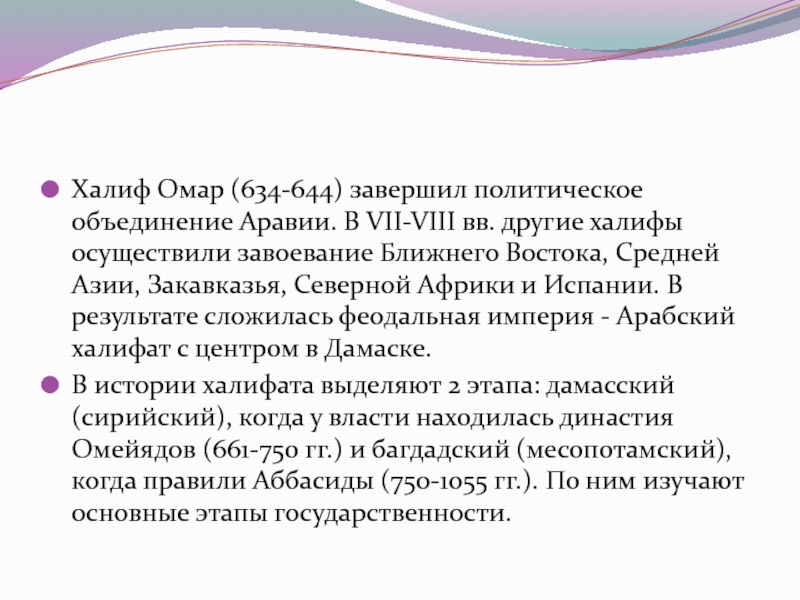 Слайд 7Халиф Омар (634-644) завершил политическое объединение Аравии. В VII-VIII вв.