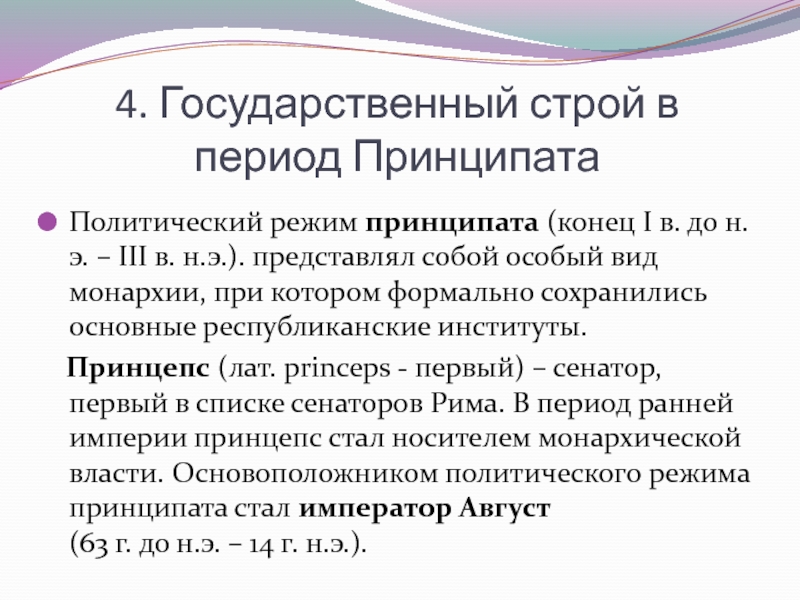 Принцепс (лат. princeps - первый) – сенатор, первый в списке сенаторов Рима. В период ранней империи принцепс стал носителем монархической власти. Основоположником политического режима принципата стал император Август (63 г. до н.э. – 14 г. н.э.).
