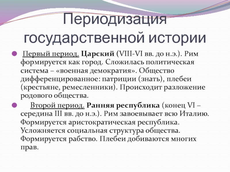 Второй период. Ранняя республика (конец VІ – середина ІІІ вв. до н.э.). Рим завоевывает всю Италию. Формируется аристократическая республика. Усложняется социальная структура общества. Формируется рабство. Плебеи добиваются многих прав.