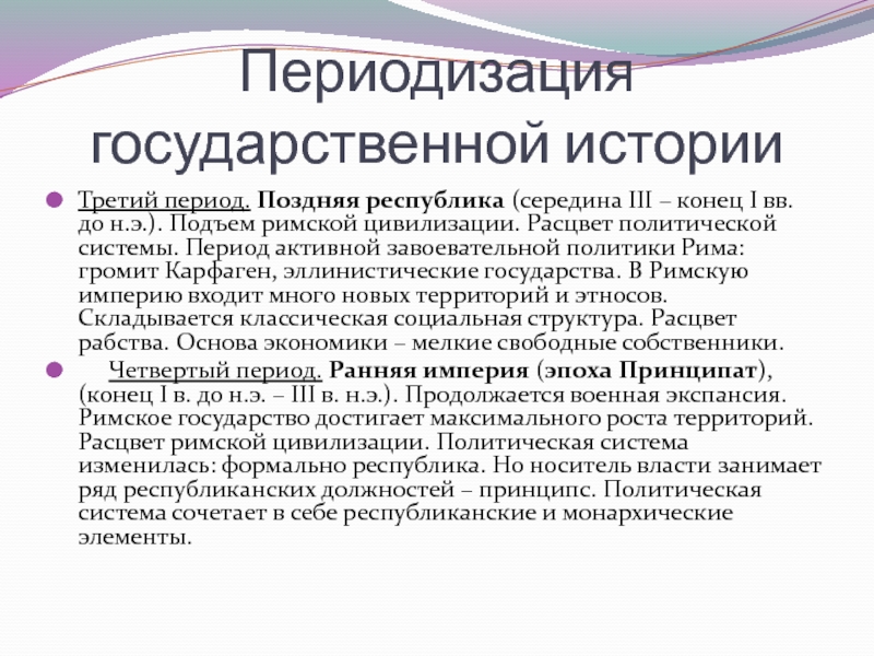 Период активной завоевательной политики Рима: громит Карфаген, эллинистические государства. В Римскую империю входит много новых территорий и этносов. Складывается классическая социальная структура. Расцвет рабства. Основа экономики – мелкие свободные собственники.