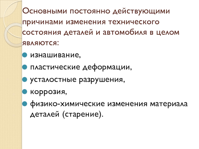Основными постоянно действующими причинами изменения технического состояния деталей и автомобиля