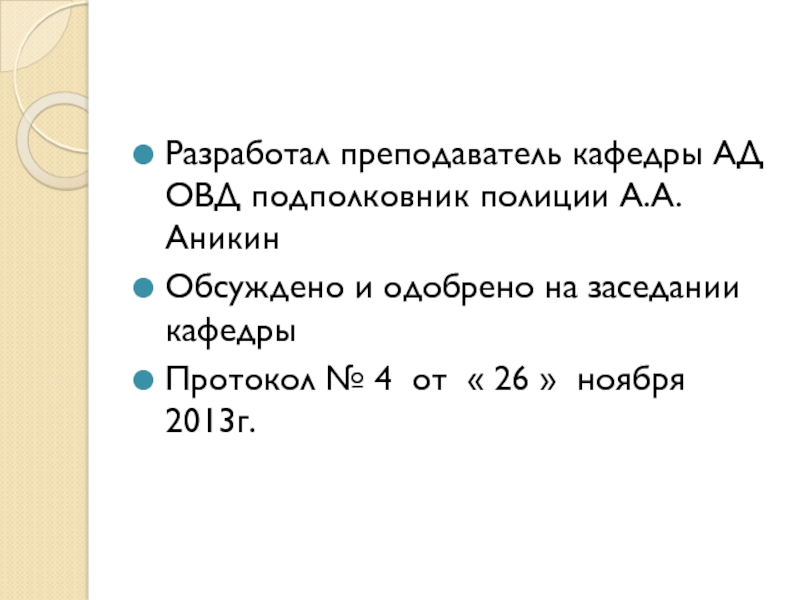 Слайд 15Разработал преподаватель кафедры АД ОВД подполковник полиции А.А.Аникин