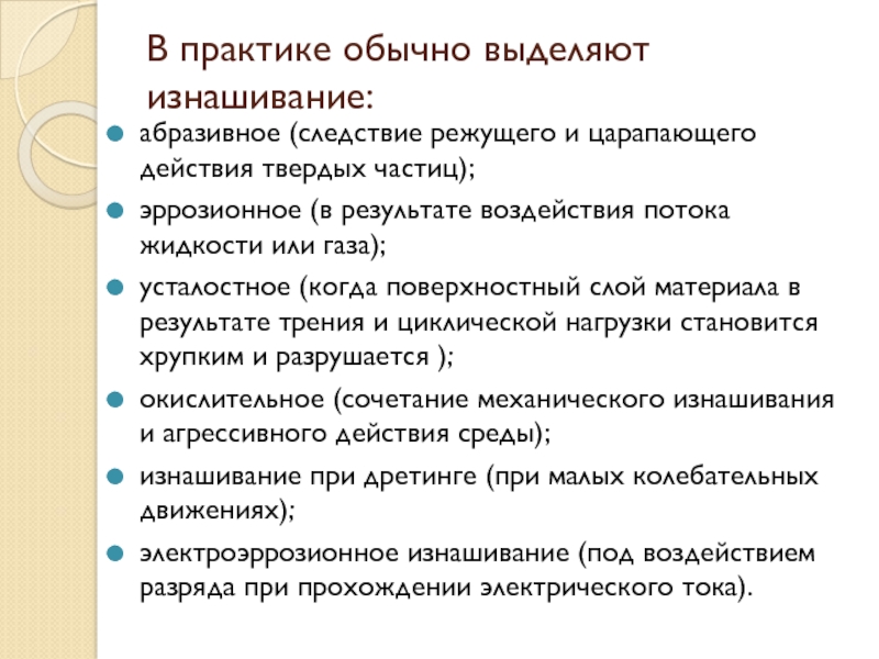 усталостное (когда поверхностный слой материала в результате трения и циклической нагрузки становится хрупким и разрушается );