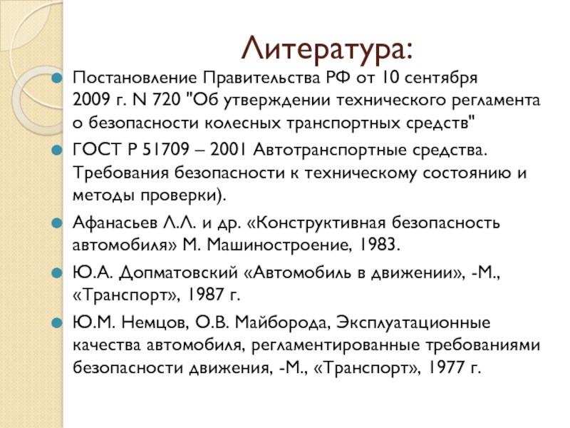 Афанасьев Л.Л. и др. «Конструктивная безопасность автомобиля» М. Машиностроение, 1983.