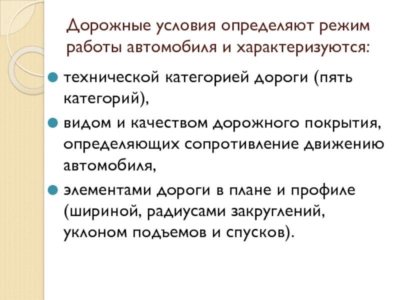Дорожные условия определяют режим работы автомобиля и характеризуются: