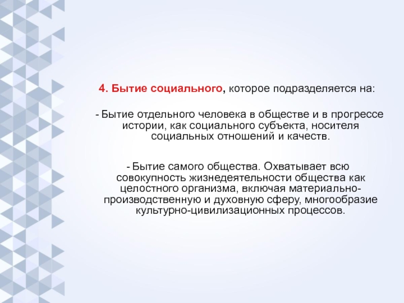 Бытие самого общества. Охватывает всю совокупность жизнедеятельности общества как целостного организма, включая материально-производственную и духовную сферу, многообразие культурно-цивилизационных процессов.