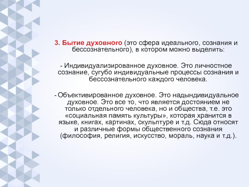 Слайд 103. Бытие духовного (это сфера идеального, сознания и бессознательного), в котором