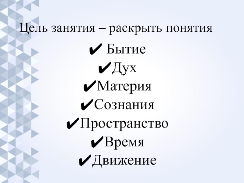 объективной и субъективной реальности. Является синонимом понятий «существование» и «сущее». Часто выступает как элемент понятийной оппозиции (например, бытие и сознание, бытие и мышление, бытие и сущность). Бытие, субстанция, материя, дух, пространство-время, бесконечность.