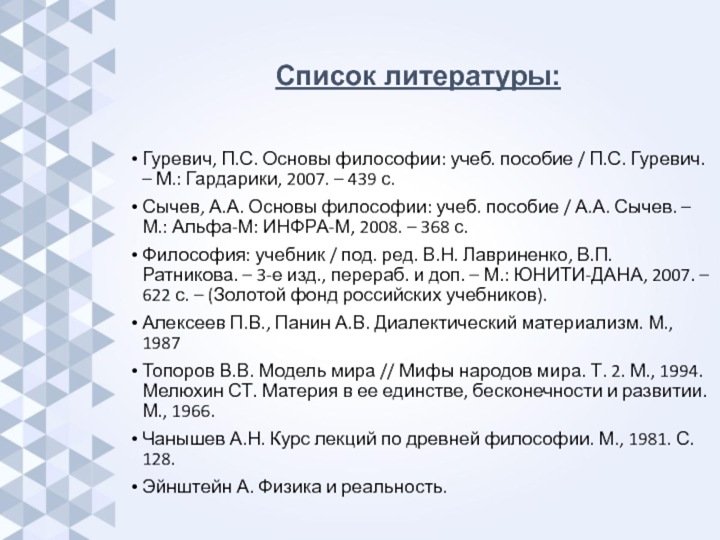 Топоров В.В. Модель мира // Мифы народов мира. Т. 2. М., 1994. Мелюхин СТ. Материя в ее единстве, бесконечности и развитии. М., 1966.