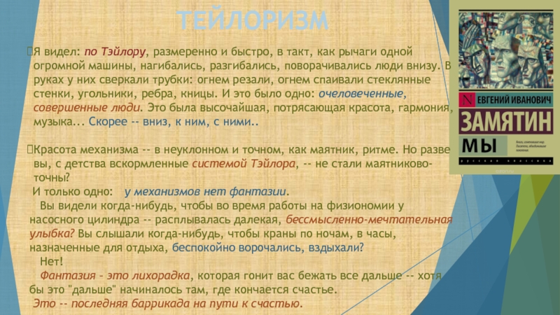 Красота механизма -- в неуклонном и точном, как маятник, ритме. Но разве вы, с детства вскормленные системой Тэйлора, -- не стали маятниково-точны?