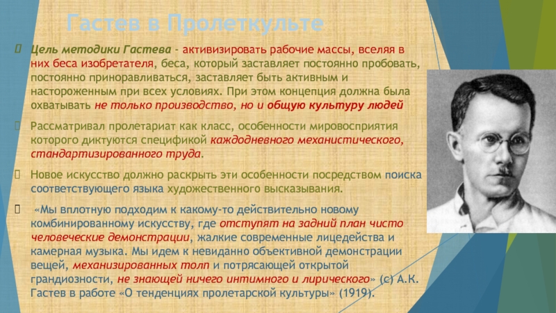 «Мы вплотную подходим к какому-то действительно новому комбинированному искусству, где отступят на задний план чисто человеческие демонстрации, жалкие современные лицедейства и камерная музыка. Мы идем к невиданно объективной демонстрации вещей, механизированных толп и потрясающей открытой грандиозности, не знающей ничего интимного и лирического» (с) А.К.Гастев в работе «О тенденциях пролетарской культуры» (1919).
