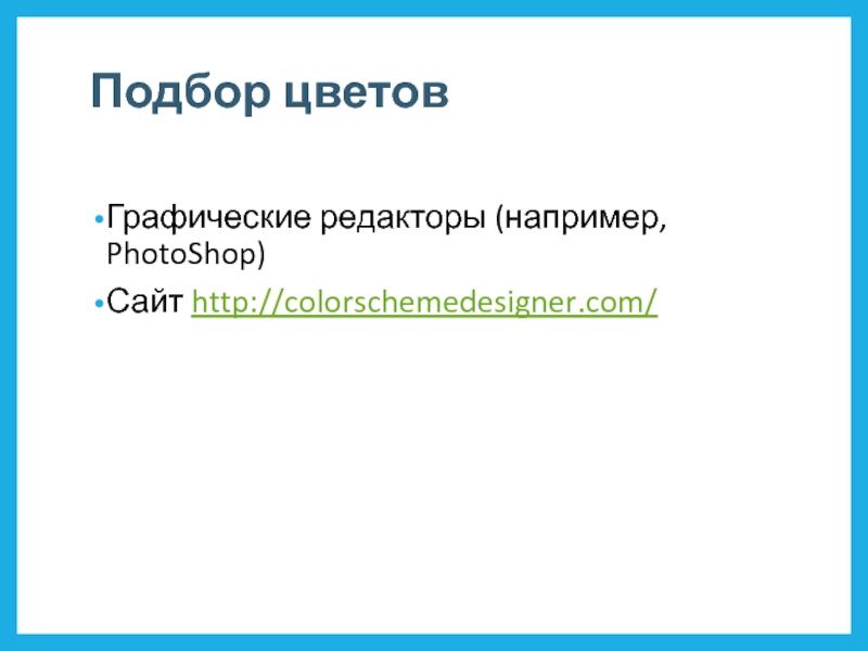 Подбор цветовГрафические редакторы (например, PhotoShop)Сайт http://colorschemedesigner.com/