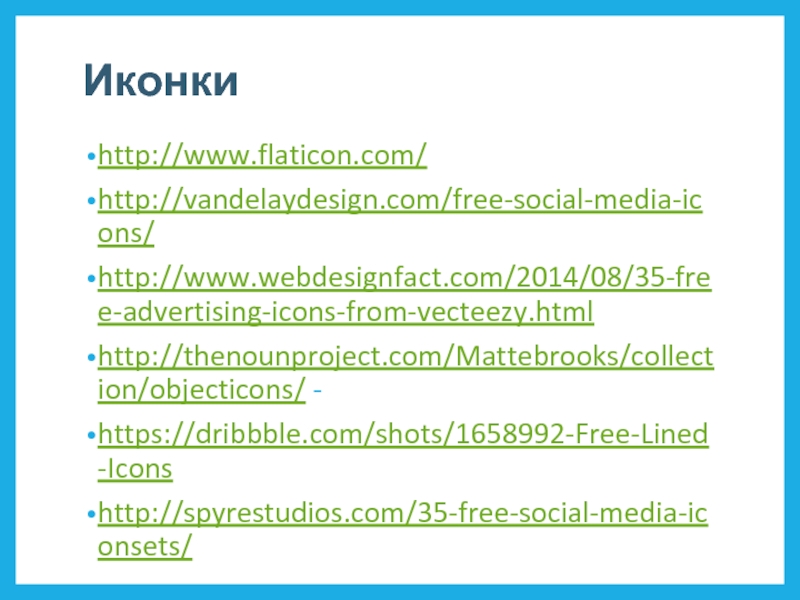 Иконкиhttp://www.flaticon.com/ http://vandelaydesign.com/free-social-media-icons/ http://www.webdesignfact.com/2014/08/35-free-advertising-icons-from-vecteezy.html http://thenounproject.com/Mattebrooks/collection/objecticons/ - https://dribbble.com/shots/1658992-Free-Lined-Icons http://spyrestudios.com/35-free-social-media-iconsets/