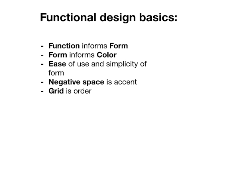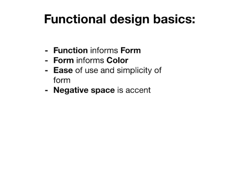 Functional design basics:Function informs FormForm informs ColorEase of use and simplicity of formNegative space is accent