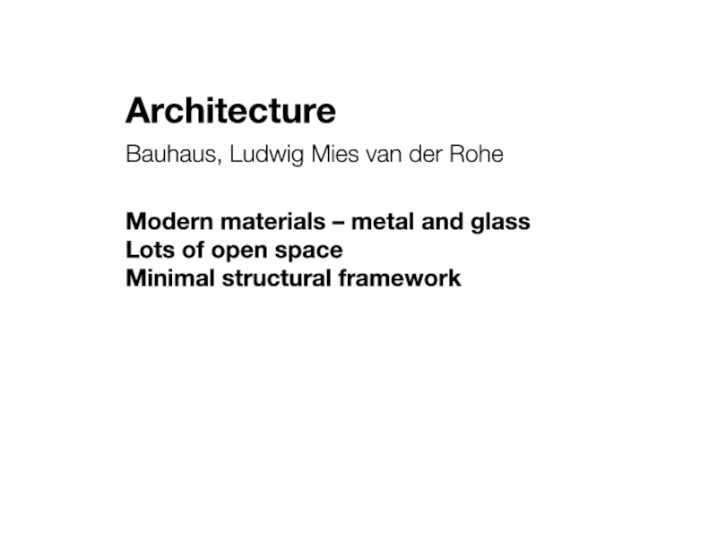 ArchitectureBauhaus, Ludwig Mies van der RoheModern materials – metal and glassLots of open spaceMinimal structural framework
